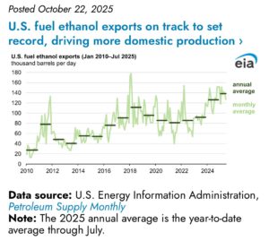 According to a new EIA analysis, the United States is on track to export a record amount of fuel ethanol for the second year in a row in 2025, driven by growing international demand.