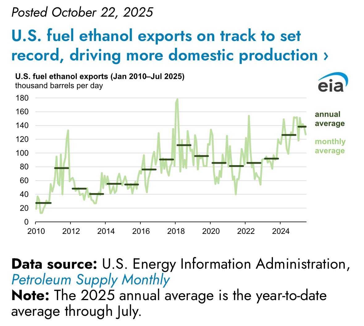 In the first seven months of 2025, U.S. fuel ethanol exports averaged 138,000 barrels per day (b/d)—the highest January through July average in our data, which goes back to 2010, and 9% more than 2024’s annual record of fuel ethanol exports. Growing international demand and a slight increase in production capacity are driving the high fuel ethanol exports this year.